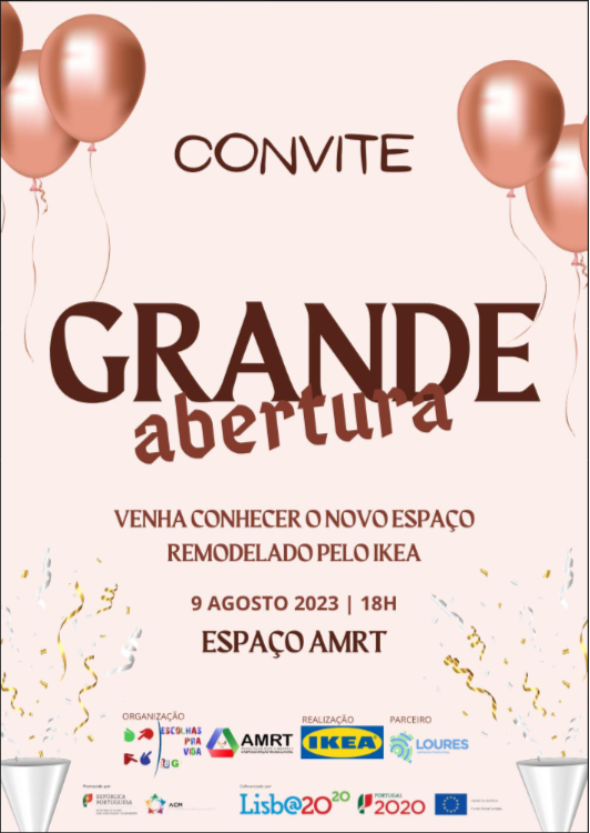 AMRT convida utentes, associados, população em geral para inauguração do novo espaço da AMRT na Apelação sito na Rua Ary dos Santos 15-A Quinta da Fonte. Quarta-feira dia 9 de agosto 2023 pelas 18 horas para conhecer as boas alterações efetuadas com a remodelação realizada na semana passada bem como a nova disposição do espaço com os e equipamentos cedidos e colocados pela equipa da área social do IKEA.