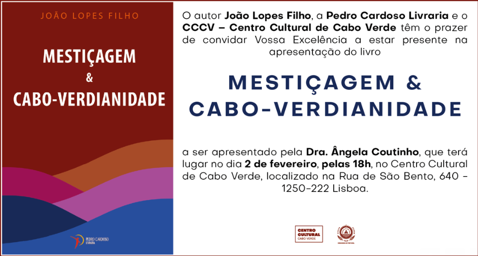 O autor João Lopes Filho, a Pedro Cardoso Livraria e o CCCV – Centro Cultural de Cabo Verde convidam a todas e todos para a apresentação do livro “Mestiçagem & Cabo-Verdianidade”, a ter lugar no dia 02 de fevereiro, pelas 18h, no CCCV, localizado a Rua de São Bento, nº 640, 1250-222 Lisboa. A entrada é livre. A apresentação estará a cargo da Dra. Ângela Coutinho.